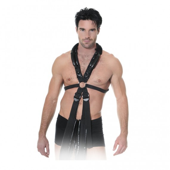 Фиксация крепится на мужчине как сбруя, и женщина удерживается на весу при помощи петель для ног и специальных креплений на шее мужчины
